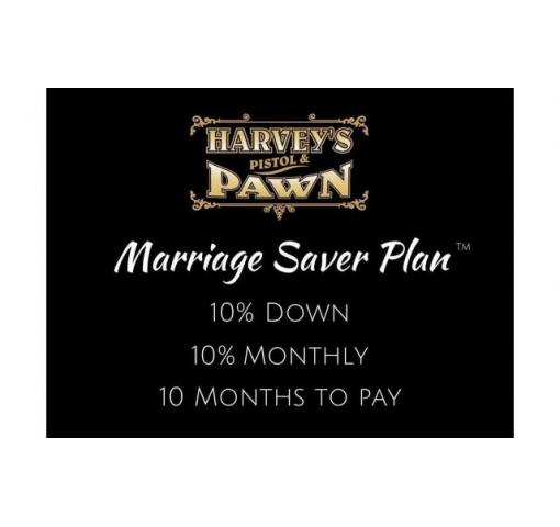 Our Marriage-Saver (TM) layaway is available to everyone and offers you 10 payments with only 10% down ($25 minimum) and additional payments of at least 10% once every 30 days for a one-time $10 setup charge.