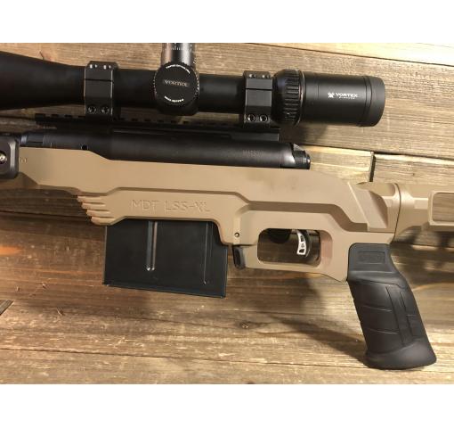 It's Awesome Auction (TM) time again at Harvey's Pistol & Pawn in Knoxville, TN! For this auction we offer a pre-owned without box Savage model 110 chambered in 338Lapua Magnum (318250.23X887)! This Awesome Auction features: 27.5" barrel including the muzzel device; MDT LSS-XL FDE color stock; MDT furniture; Free floating barrel; Savage Arms brand Accu-trugger; Comes with a mounted Vortex Viper 50 6-24X50 scope; Includes one detachable box magazine.